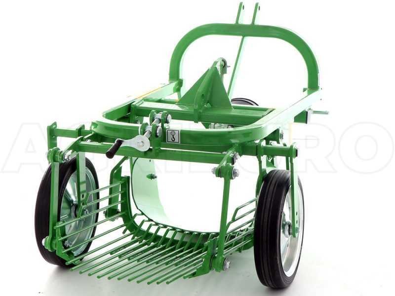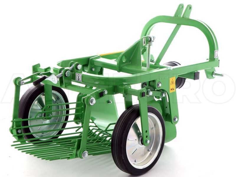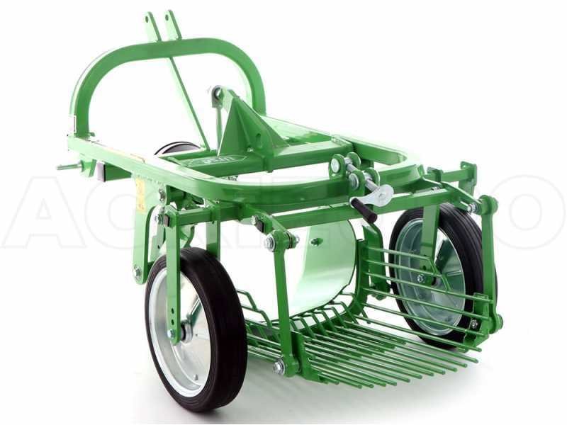 La machine est constituée d’un soc vibrant avec profondeur d’excavation réglable qui transfère les pommes de terre et la terre sur la trémie vibrante en tamisant les pommes de terre du sol. La profondeur d’excavation est réglée par les roues de support arrière.
