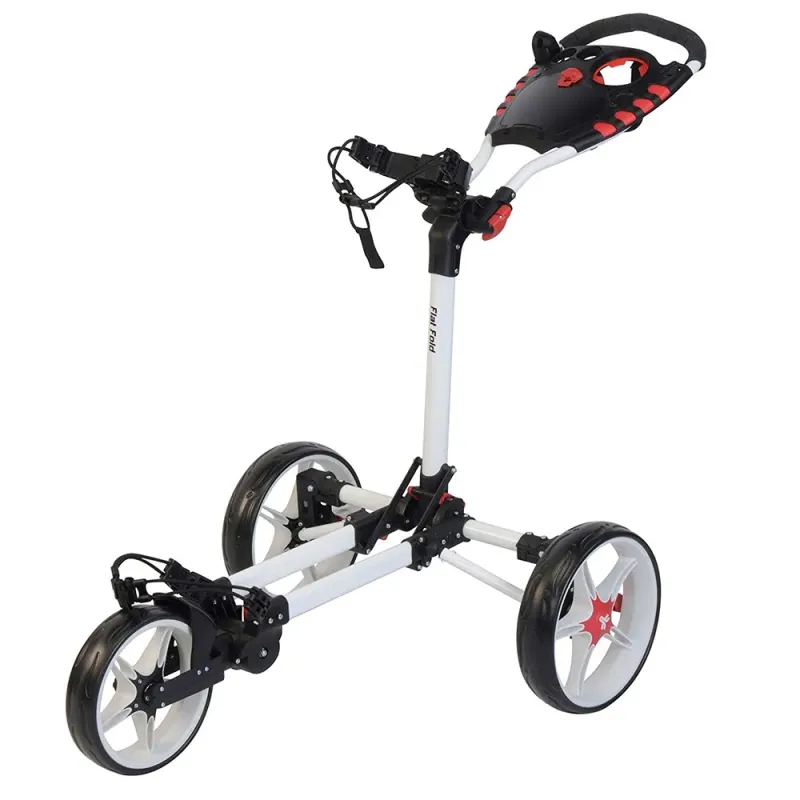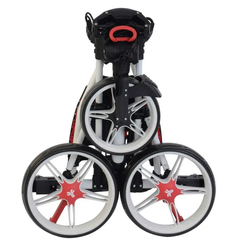 Le chariot Fast Fold blanc est extrêmement bien conçu avec ses sangles élastiques sa console complète (porte-carte porte-boisson porte-balle porte-crayon porte-tee…) son compartiment de rangement sans oublier son double système de frein à pied sur chaque roue.