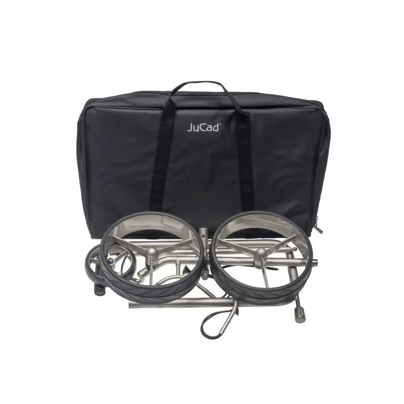 Plus qu’un simple chariot de golf, ce chariot en titane sans moteur est ultra léger et se caractérise par son élégance et sa robustesse. Équipées de quatre roulements à bille les grandes roues à fixation rapide offrent le plus grand confort de déplacement. Avec des dimensions de rangement de seulement 65x35x10 centimètres le JuCad Titan se démonte facilement et il se loge dans le plus petit coffre de voiture. Démonté le chariot peut même être mis dans une housse de voyage et il est le compagnon idéal pour les golfeurs voyageant en avion. La poignée réglable en hauteur permet de tirer ou de pousser le chariot en ménageant particulièrement le dos votre musculature reste détendue. Ce chariot ne connaît pas de limite de poids et se prête aussi pour les sacs de golf lourds des golfeurs professionnels.