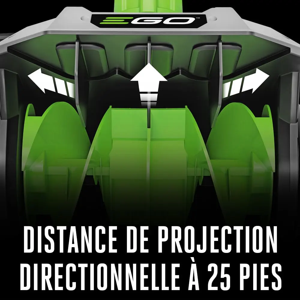 Le kit de pelle à neige fait a partie du système EGO POWER+ à plusieurs têtes. Le contrôle directionnel de sa distance de projection allant jusqu’à 25 pi la rend différente de toute autre pelle à neige sans fil sur le marché.