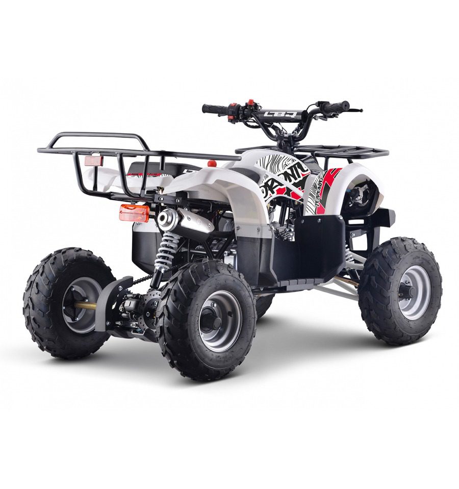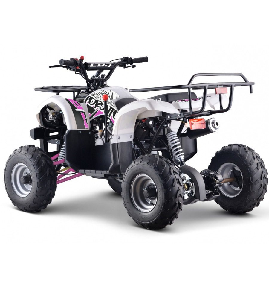 Comme nous l’avons déjà évoqué, ce quad enfant LBQ est puissant ; puissance qu’il tire de son moteur 4 temps de 125cm3 capable de générer une puissance maximale de 6,8 cv à 7500 tr/min. Fonctionnant avec une boîte de vitesses automatisée, le quad 125cc enfant dispose d’une marche arrière. Ainsi, le pilote pourra se tirer de toute erreur de trajectoire. Nous avons bien conscience que les capacités de ce quad thermique enfant peuvent effrayer, refroidir les parents. Pourtant, il n’y a aucune raison puisque ce quad 125cc dispose d’un limiteur de vitesse fonctionnant via une vis de bridage des gaz. En touchant cette vis, vous pourra modifier la réactivité de la poignée du quad enfant. Cela permet donc au petit pilote, s’il est débutant, de commencer l’aventure doucement, à vitesse lente ; ou bien, s’il a déjà fait ses gammes sur un pocket quad, de rouler, dès le début à pleine vitesse. Cette décision vous appartient !