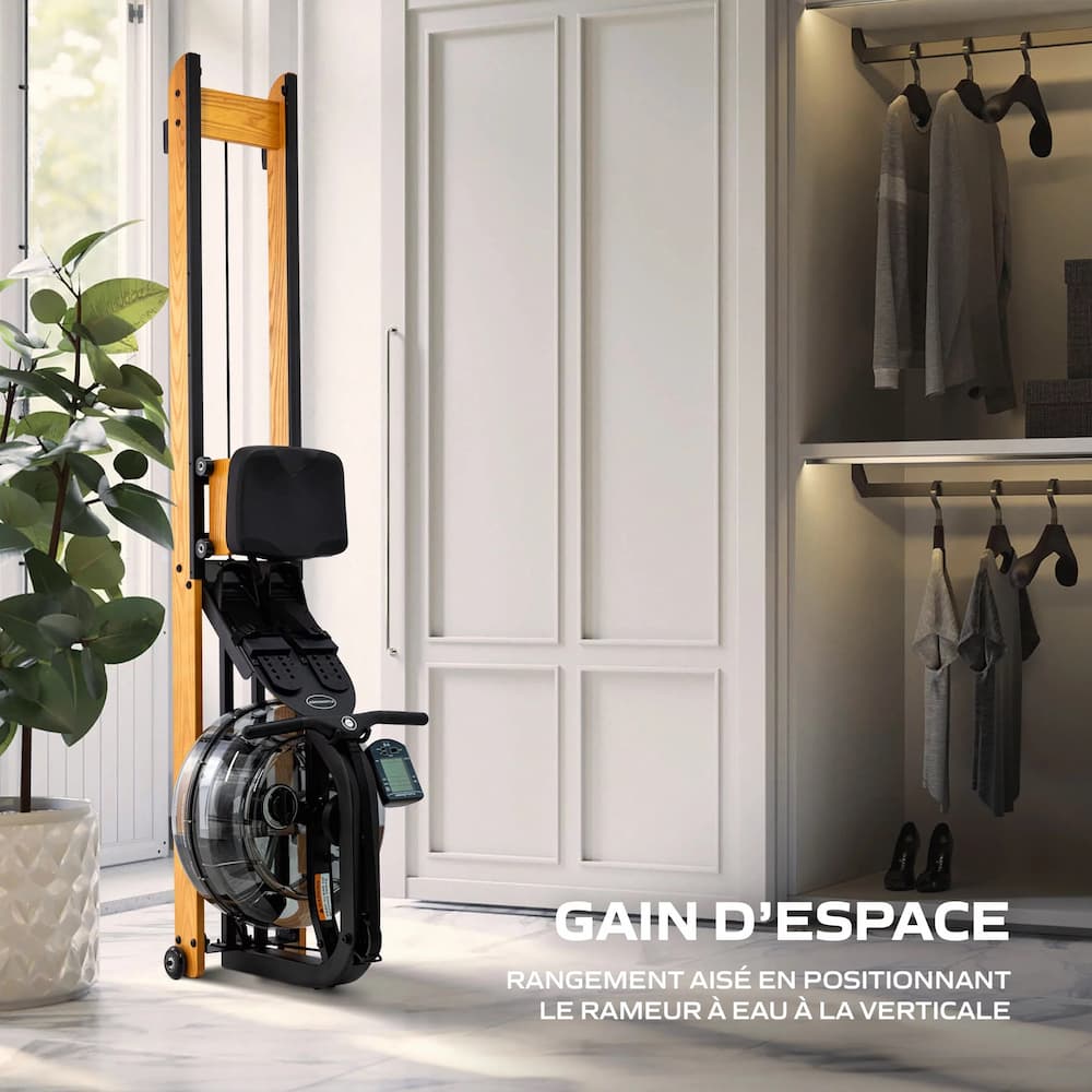 - Possibilité de mettre le rameur à la verticale pour optimiser l’espace grâce à ses roulettes de déplacement.