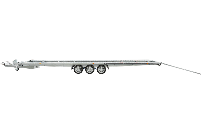 Équipée de trois essieux freinés de 1350 kg chacun, cette remorque assure stabilité, sécurité et tenue de route optimale, même à pleine charge. Les roues sont positionnées sous la surface de transport, permettant un plateau large et dégagé.