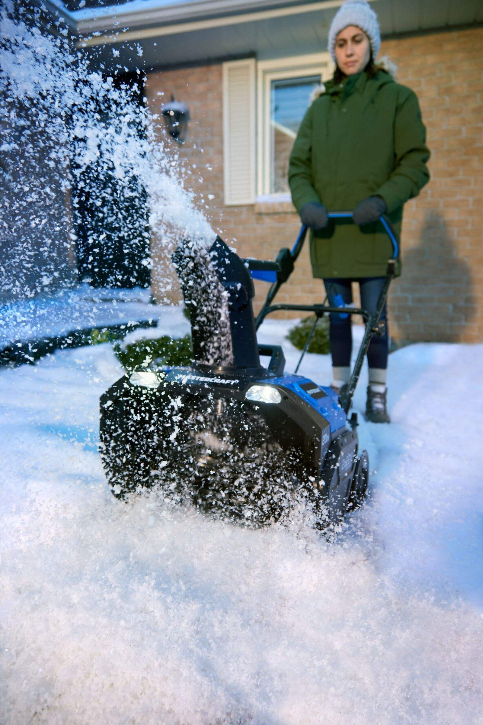 Souffleuse à neige sans fil Mastercraft 2 x 20 V avec batterie PWR POD 5 Ah. Largeur 50,8 cm, hauteur 30,5 cm, roues compactes et goulotte rotative 180°. Garantie 3 ans.