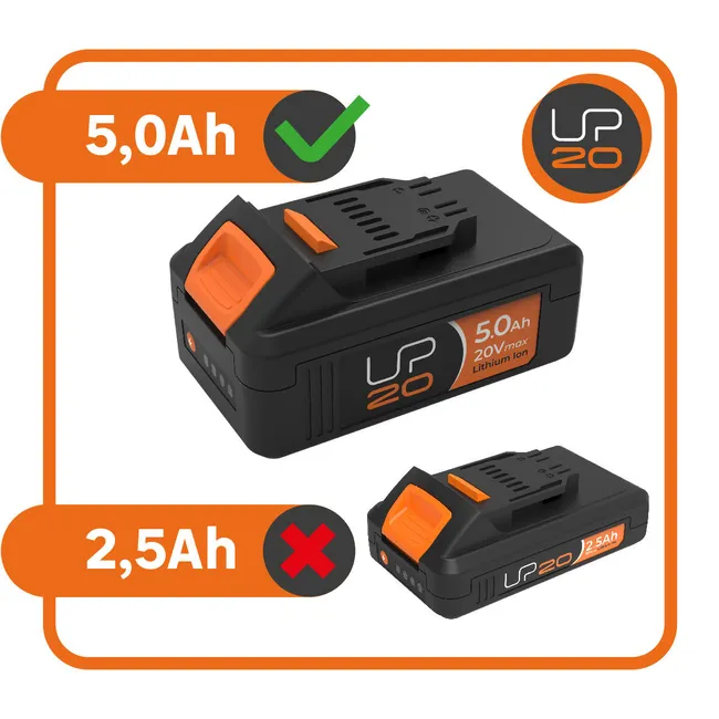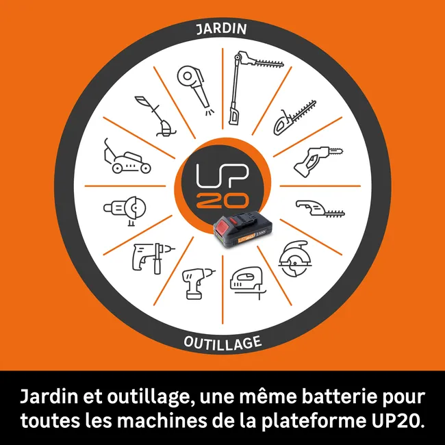 Cette tondeuse est vendue sans batterie et sans chargeur. Pour une tonte optimale, nous vous recommandons d’utiliser la batterie 20V UP20 5.0Ah. La plateforme UP20 : une batterie pour tailler, tondre, débroussailler… mais aussi scier, poncer, percer et visser. La batterie UP20 convient à vos outils de jardinage STERWINS et à vos outils de bricolage Dexter.