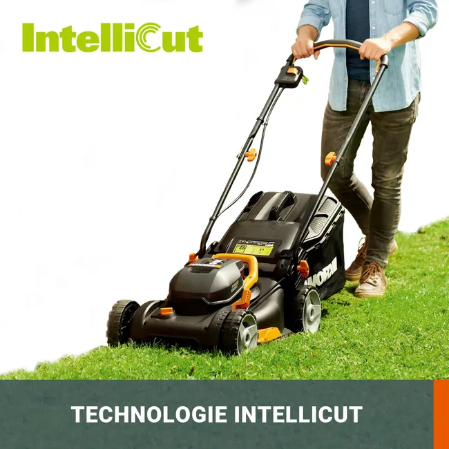 La WORX WG743E 40V est une tondeuse sur batterie 2 en 1, idéale pour des jardins jusqu’à 450 m² par charge. Sa largeur de coupe de 40 cm et ses 2 batteries 20V assurent une tonte nette et rapide, tandis que la technologie Intellicut™ ajuste automatiquement la vitesse de la lame selon la densité du gazon.