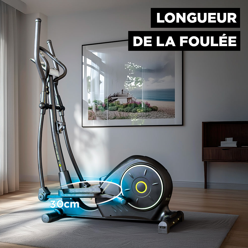 Le Dragon III est un elliptique compact et doté de 24 programmes. 24 niveaux de résistance, inertie de 12 kg, prise de pulsations cardiaques par capteurs tactiles, porte tablette, console rétro-éclairée.